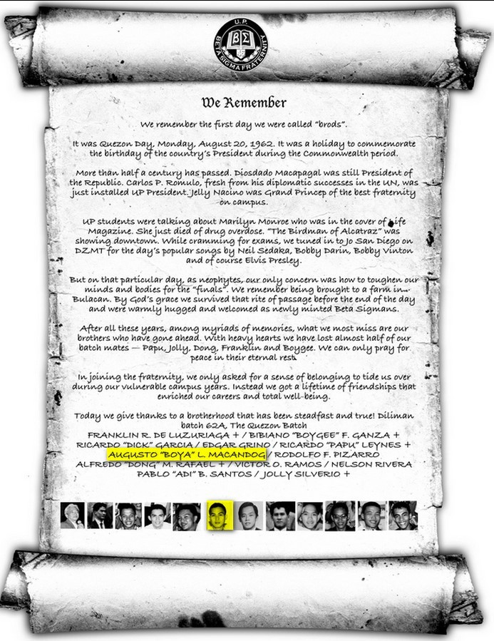 Rivera62, your kabatch Augusto "Boya" Macandog passed away this morning. No