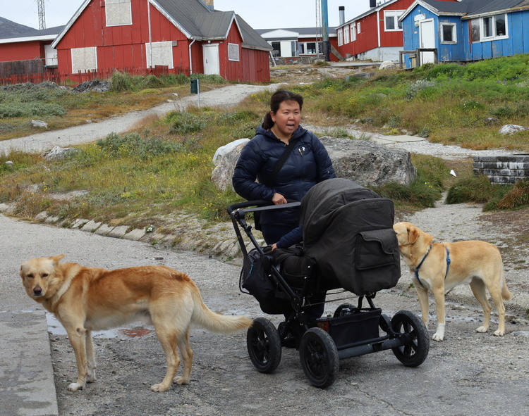 Inuit woman walks her baby in a stroller with her dogs.
