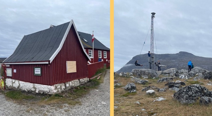 Nanortalik Museum and Inuit boys playing on the swing atop the rocks