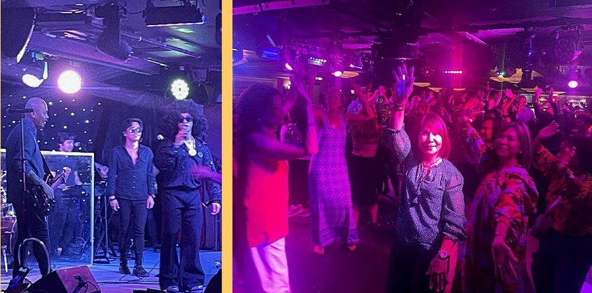 Norwegian Star's cruise director, also a Filipino, sporting an Afro at a 70's disco night, leads the revelers as they dance to the bouncy beat.