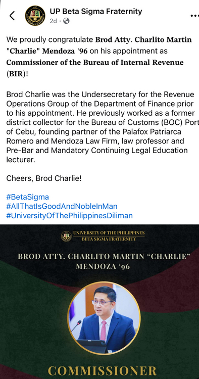 Brod Atty. Charlito Mendoza, UPD'96, is new BIR Commisioner