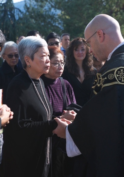 Cristopher, Christina and Barbara bring in their dad's ashes for the funeral mass.