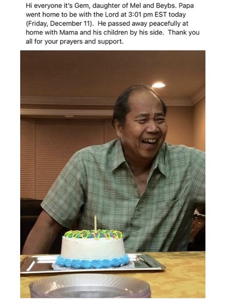 Mel and I deeply grieve his passing but the Lord willed to put an end to his