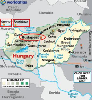 Buda (hills side) and Pest (plains side) on opposite sides of the Danube River comprise Budapest.