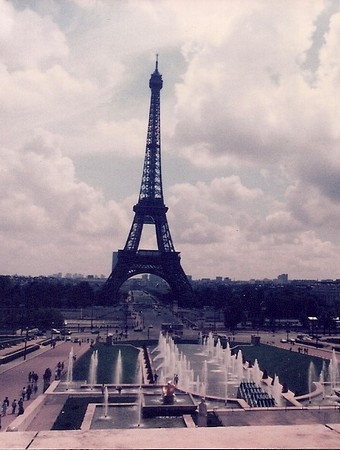 Eiffel Tower under cloudy skies; and across Arc de Triomphe with our travel guide - Arthur Frommer's "Europe on $25 a Day".
