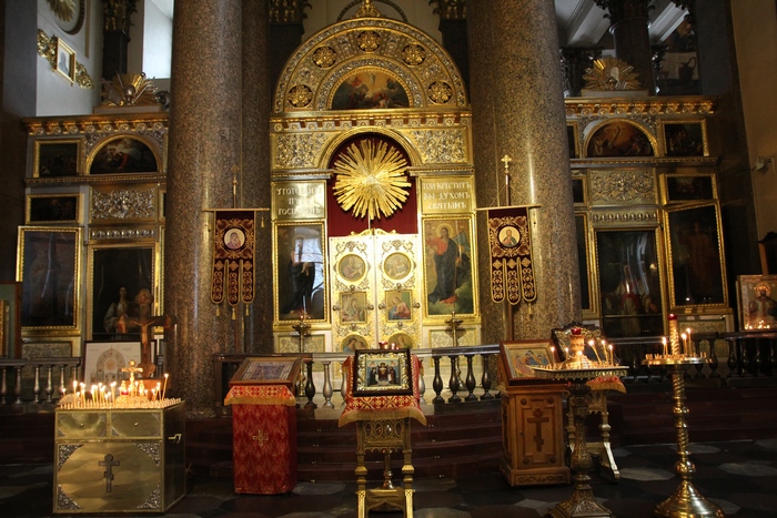 Saint Isaac's Cathedral is the largest Russian Orthodox cathedral in the city. It is dedicated to Saint Isaac of Dalmatia, a patron saint of Peter the Great. The church on St Isaac's Square was ordered by Tsar Alexander I and took 40 years to construct from 1818 to 1858. With the fall of communism, regular worship activity has resumed in the cathedral. The cathedral's main dome rises 333 feet and is plated with pure gold and is decorated with twelve statues of angels. Internal features are composed of multicolored granites and marbles.