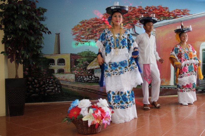 Mayan dancers perform inside the restaurant at the tour stop's lunch buffet