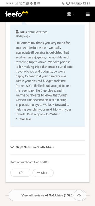 My rejoinder for this travelogue is my review of our SA Safari Adventure and response of Go2africa Pty. Cheers!!!