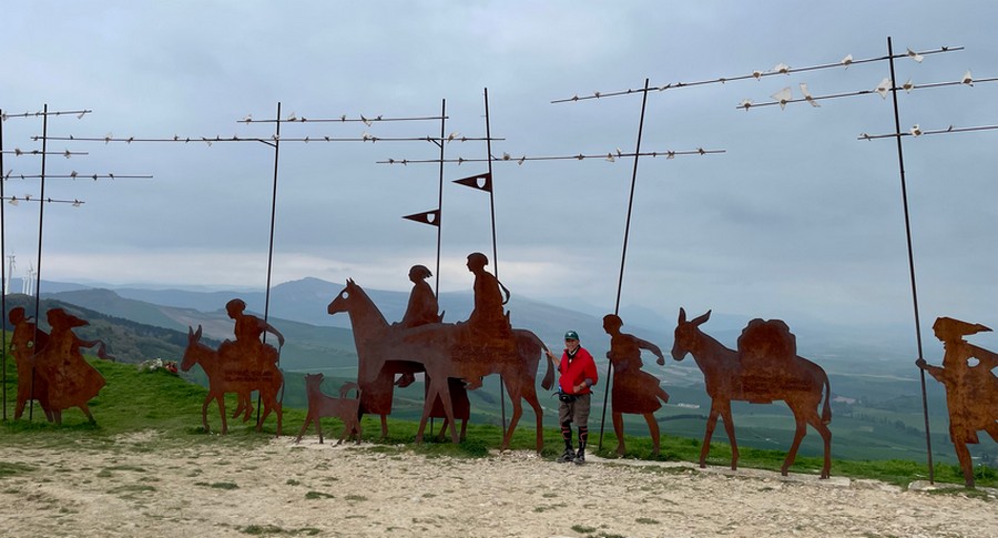 Alto del Perdon offers one of the most beautiful panoramic views of the Camino Frances. The sheet metal represents pilgrims from various eras.