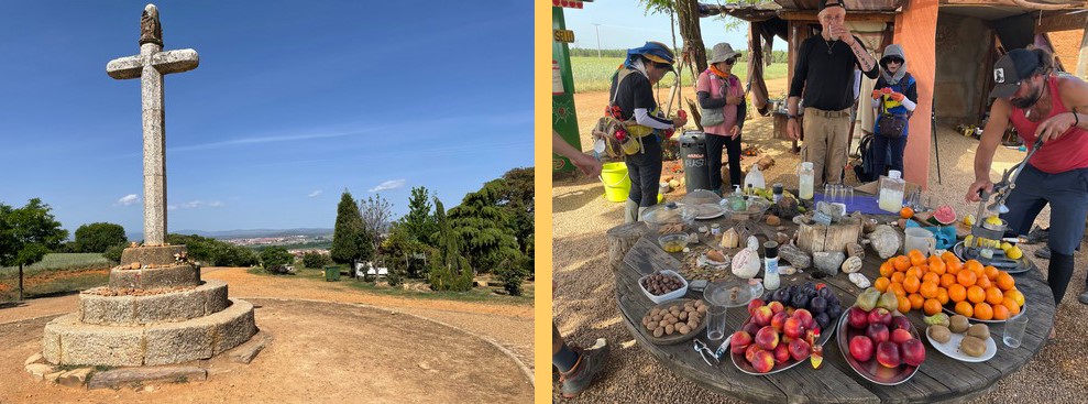 In San Justo de la Vega: Cruceiro de Santo Toribio; "donativo" fruit/snack stand; singing guitar man; and Thirsty Pilgrim statue.