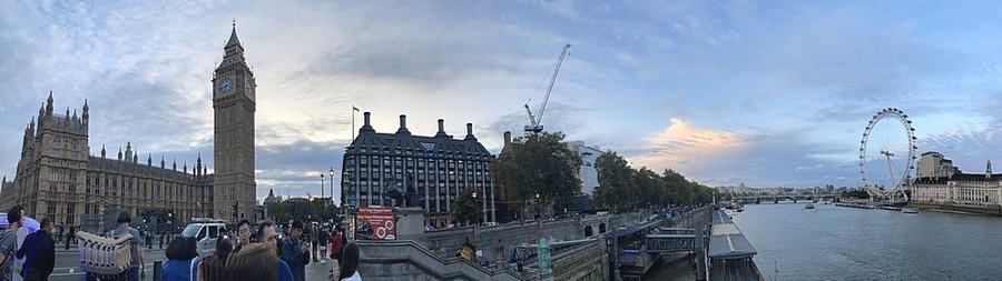 Panoramic view of Palace of Westminster (or Houses of Parliament), Big Ben, River Thames and London Eye (ferris wheel).