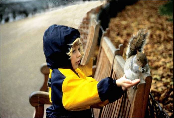 The clothing of the child playing with squirrel aptly describes the season of the year.