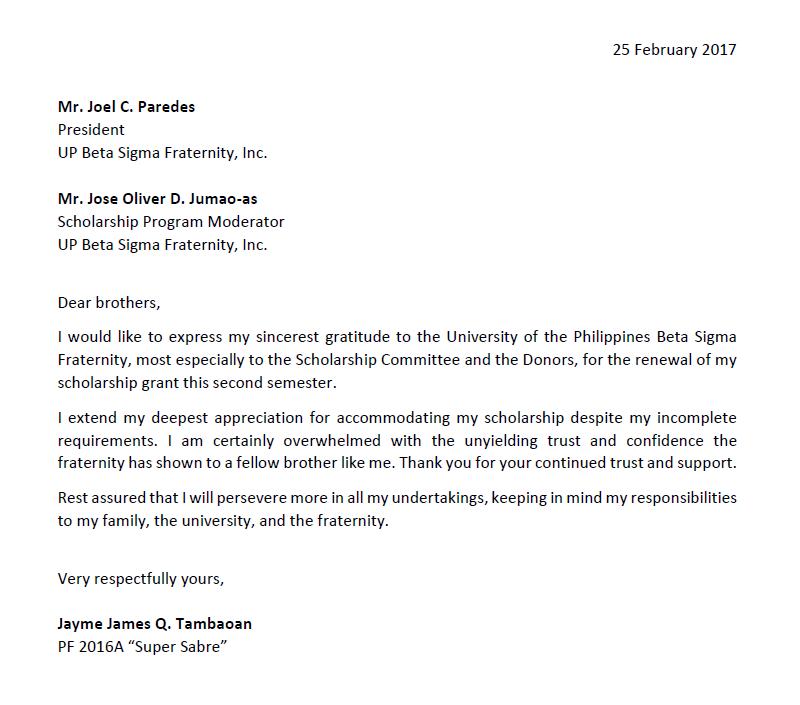 I am so grateful to be included as one of the recipients of the UP Beta Sigma Fraternity Scholarship Program. I have told my parents about this