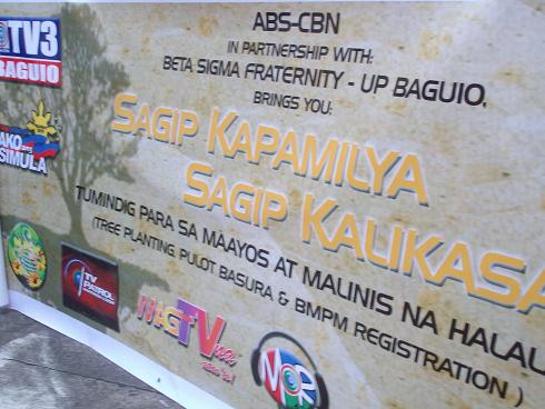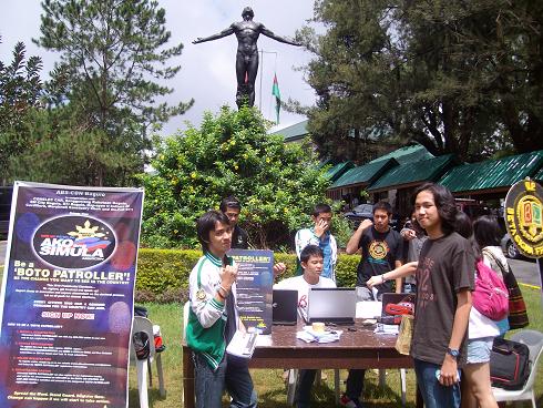 (2) Here are the pictures of the the AKO ANG SIMULA event with ABS-CBN. It was the first of our projects that promote youth involvement in the upcoming elections. It was a really successful event and the fraternity was well-promoted by the media. We underwent a series of interviews during ABS-CBN Northern Luzon's morning talk shows and two episodes of the Regional TV Patrol featured our activity. One even featured a long segment which was set in campus with our fraternity's seal as the background. The project really benefited us, we made our parents really proud as they saw on TV what we were doing. The event started early in the morning. We started by an early visit to the studio for a quick final promotion of the event. Then we proceeded with a parade going to the first leg of the day's plan of activities - tree planting. We planted trees along a highway in Baguio, covered over a mile long stretch and were able to plant more than 500 trees. After that we proceeded to the university for the registration of the Boto Mo Ipatrol Mo program of the ABS-CBN. 500 registrants came and we were more than happy to accomodate them especially the ladies, he he. Later that day, we also held a small concert which featured UP bands; this was also the segment wherein we asked the different political parties in UPB to give some words with regard to our advocacy. To top things off, and one of the most heart-warming parts of the event, was that it was a benefit/charity event for a little girl who had cerebral problems. Thankfully, we were able to collect a fair amount which her mom said was enough to cover a month's worth of medical check-ups. Truly, seeing the joy in the mom's eyes was something we couldn't forget.