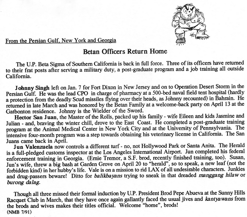 Twenty three years ago, two of UP SoCal Chapter's members served in "Desert Storm" in the Persian Gulf War: Johnny Singh, UPLB '68 and Carl Zabat, Jr., UPD '83. I remember we ran feature articles on them in two issues of the "Los Angeles Betan", which I had edited from 1991-92. I dug out my copies of these vintage newsletters and thought of re-publishing them here in our website in remembrance and in honor of our country's veterans.